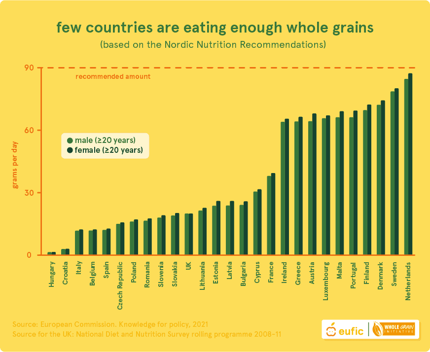 Although many European dietary guidelines recommend replacing refined cereals with whole grains, and some countries advise a daily intake of 75-90 grams, data from the Global Dietary Database shows we are not even meeting a lower recommended intake of 50 grams in 16 of the 27 EU Member States.